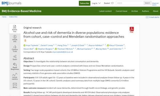 「今回の結果だけでアルコールが認知症の直接原因と断定はできませんが、アルコール摂取と脳リスクの関連を裏付ける多数の証拠のひとつです」