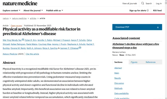 マス・ジェネラル・ブリガムの研究により、「1日5000歩〜7500歩」という中程度の運動習慣が、アルツハイマー病の進行と関連の深いタウタンパク質の蓄積速度を顕著に遅らせることが判明しました。これは、高価な薬剤や治療法に頼らず、日常生活で取り入れられる「歩く」という行為が、重大な神経変性疾患の進行を抑制する有効な手段となり得ることを示すものです。座りがちな高齢者に対する、具体的で達成可能な身体活動の目標設定が、今後のアルツハイマー病予防戦略の柱の一つとなることが期待されます。