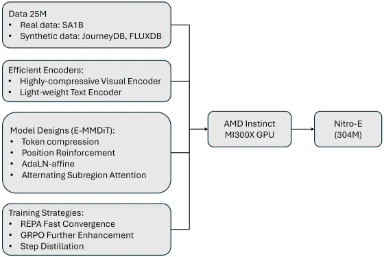 Nitro-Eは、AMDが開発したE-MMDiT(Enhanced Multimodal Diffusion Transformer)アーキテクチャを採用。