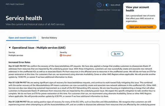 AWSの公式ステータス確認ページ(Service Health)によると、問題はUAEを指す「ME-CENTRAL-1リージョン」で発生しました。