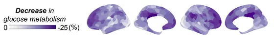 グルコース代謝の減少したところを色濃くするとこのようになります。