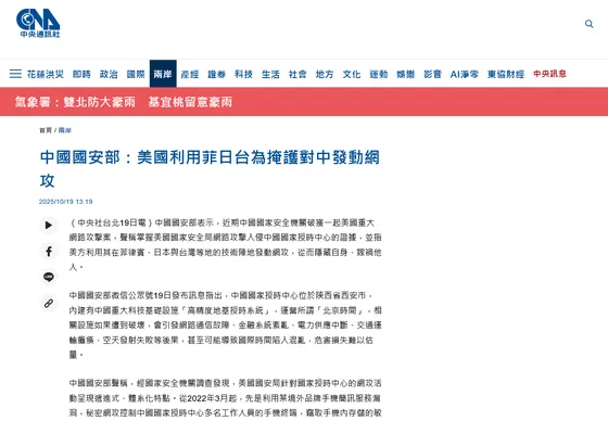 - 中國國安部:美國利用菲日台為掩護對中發動網攻 | CNA中央社
