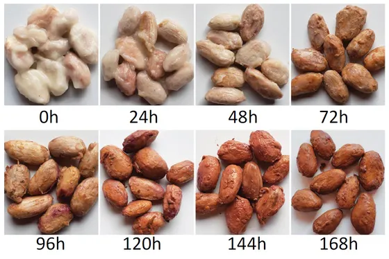 📸 以下は発酵中のカカオ豆の変化(0時間 → 168時間後)。発酵が進むにつれ、豆の色が白から茶色へと変化していく様子が確認されました。