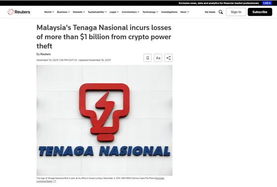 違法な仮想通貨マイニングによる電力盗難で、マレーシア国営電力会社が1700億円超の損失。摘発の実態、法制度、他国の事例からエネルギー犯罪の深刻さを解説します。