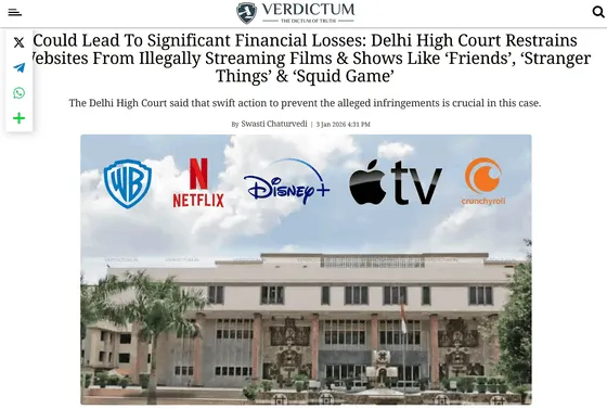 2025年12月18日、デリー高等裁判所は、Disney、Netflix、Warner Bros.、Apple、Crunchyrollなどの申立てを受け、47の海賊版ストリーミングサイトに対して差止命令を発令しました。