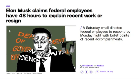 2025幎2æ23æ¥ãã¢ã¡ãªã«æ¿åºã®æ°èšçµç¹ãæ¿åºå¹çåçïŒDOGEïŒãã®ãããã«å°±ä»»ããã€ãŒãã³ã»ãã¹ã¯æ°ããå šé£éŠæ¿åºè·å¡ã«å¯Ÿããå é±äœãããã®ã説æãããè¿çããªããã°èŸè·æ±ãããšããã¡ãŒã«ãéä¿¡ããåçåºã«ç·åŒµãèµ°ããŸããð©ã