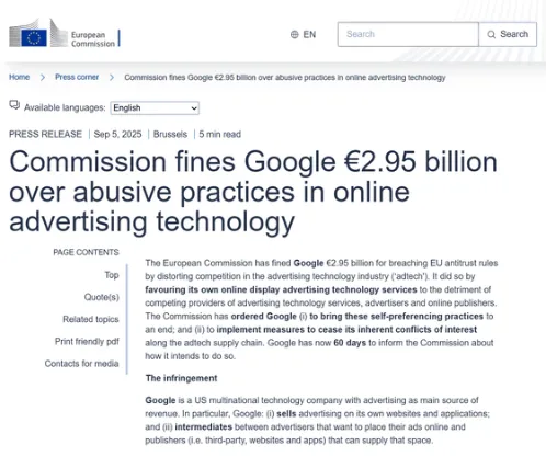 欧州委員会(EUの政策執行機関)は2025年9月5日、Googleが広告技術(アドテク)業界で競争をゆがめたとして 29億5000万ユーロ(約5000億円) の制裁金を科すと発表しました。これはEUの独占禁止法違反に対する制裁金としては 史上2番目の高額 となります。