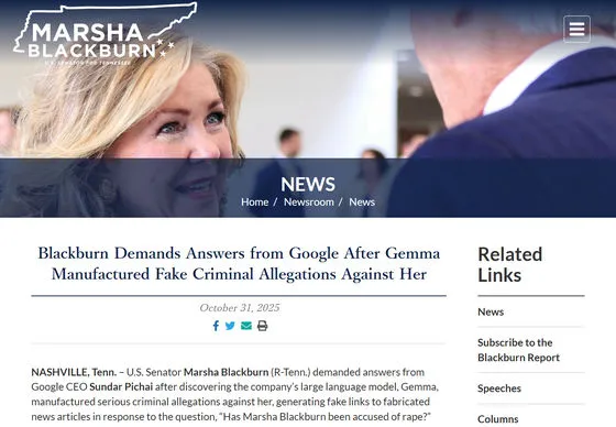 ブラックバーン上院議員がGoogleに対して「Gemmaが虚偽の犯罪容疑をでっち上げた」と抗議する書簡を公開していました。