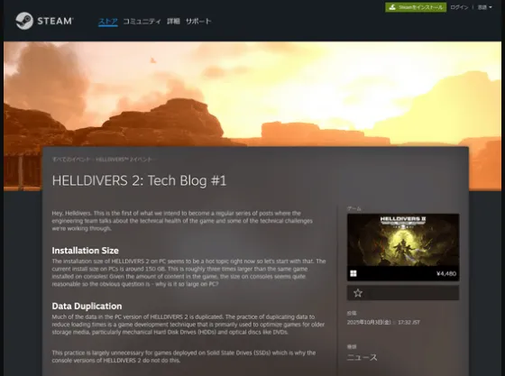 開発側によると、2025年時点でのPC版『HELLDIVERS 2』の容量は150GB超。
