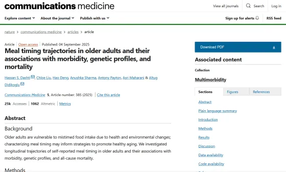 📄 出典:Meal timing trajectories in older adults and their associations with morbidity, genetic profiles, and mortality | Communications Medicine (Nature)