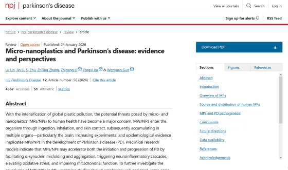 中国の広州医科大学などの研究チームが発表した最新のレビュー論文(2026年)によると、微細なプラスチック粒子が脳内に蓄積し、神経変性を引き起こす強力なエビデンスが示されています。
