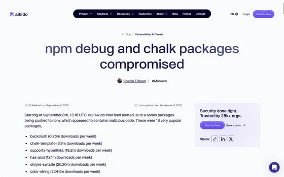 Aikido Securityによると、日本時間の2025年9月8日22時頃から、悪意のあるコードが含まれていると思われる一連のパッケージがnpmにプッシュされているという警告を確認したとのこと。対象となるパッケージは非常に人気のある18個のパッケージで、週間ダウンロード数は全部合わせて26億回に上ります。この事象が検出されて以降、npmチームは攻撃者によって公開された悪意のあるバージョンのいくつかを削除しました。