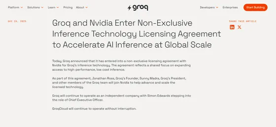 さらに、Groq側では新CEO体制(CFOがCEO就任)にも触れており、