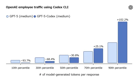 GPT-5-Codexは「簡単なタスクには瞬時に応答し、難しいタスクの場合は長く思考してから応答する」という仕組みを導入しています。以下のグラフは入力トークンの量に対する応答時間の長さを示したもので、GPT-5-Codexは少ない入力に対してはGPT-5より速く応答し、大容量の入力に対してはGPT-5より長く思考していることが分かります。