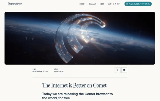 AI検索エンジン「Perplexity AI」で知られるPerplexity社は、これまで有料プラン限定で提供していた**AI搭載ブラウザ「Comet」**を、全世界のすべてのユーザーに無料開放したと発表しました。