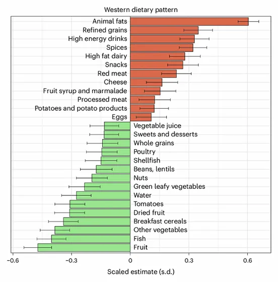 研究で問題視された「西洋式の食事」とは、動物性脂肪・精製穀物・スナック菓子・高脂肪乳製品・高カロリー飲料などが多く、逆に野菜・果物・魚などが少ない食習慣を指します。
