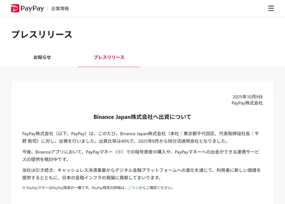 PayPayはBinance Japanの株式40%を取得し、今後の共同開発・連携を進めていくとしています。