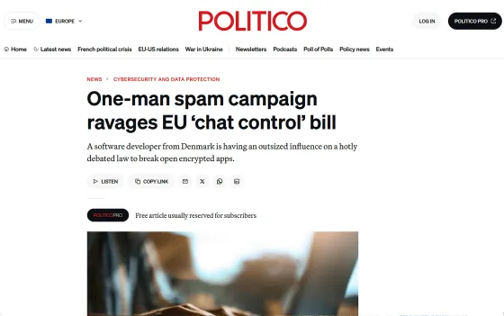 - POLITICO – One-man spam campaign ravages EU ‘chat control’ bill