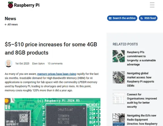 その影響はすでに表面化しており、Raspberry Piはメモリ供給難を理由に一部製品の値上げを発表しています。