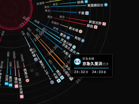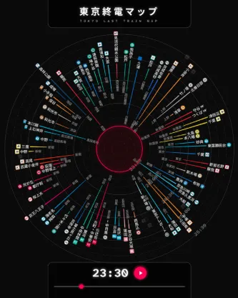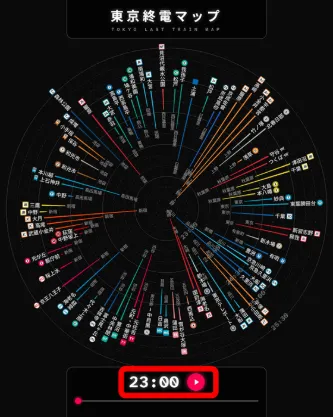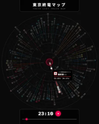 都心(山手線の主要駅)を起点に、郊外方面へ向かう終電が 時間の経過とともに消えていく様子をインタラクティブに可視化しています。