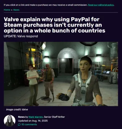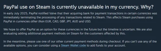 「2025年7月初旬、PayPalはValveに対して、特定通貨での決済取引を担当するアクワイアリング銀行がSteam関連取引の処理を即時停止すると通知しました」