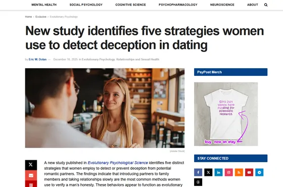 - PsyPost「New study identifies five strategies women use to detect deception in dating」