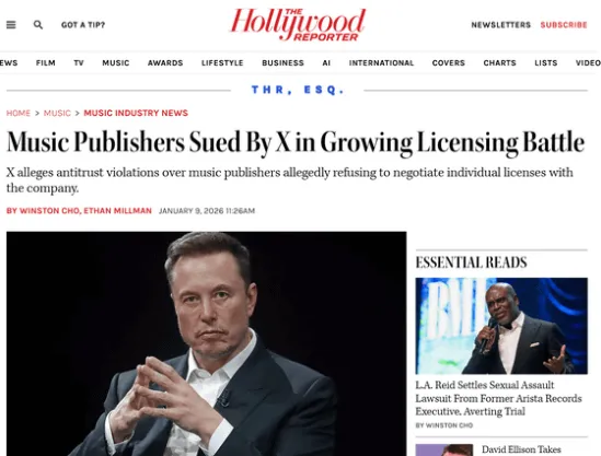 X(旧Twitter)が、音楽出版社団体のNMPA(全米音楽出版社協会)および複数の大手音楽出版社(ソニー系、ユニバーサル系、ワーナー系など)を相手に、独占禁止法(反トラスト)違反などを理由とする訴訟を起こしました。