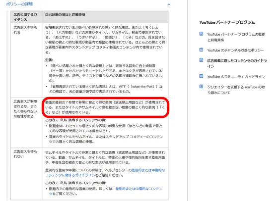 以前のガイドラインでは、動画の冒頭(特に最初の7秒間)で以下のような強めのスラングや冒とく的な言葉が使われている場合、広告収入が**「制限される」あるいは「完全に無効」になる**という厳しい制限がありました。
