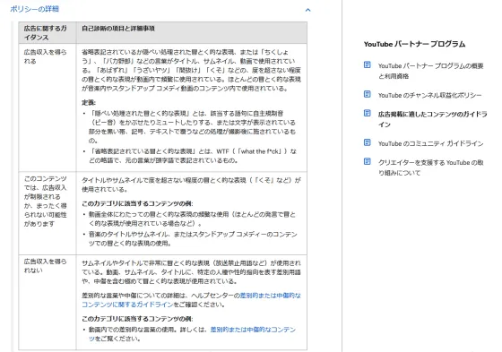 今回のルール変更は、あくまで「動画内の音声や表現」に関する緩和です。