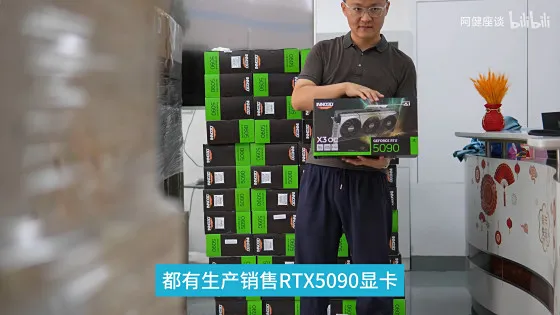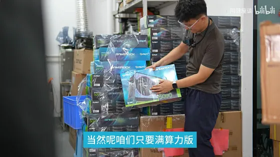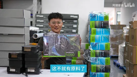 しかし映像に映っていたのは、フル性能版RTX 5090。INNO3DやPalit製の製品が山積みされており、数百枚単位で保有している様子が確認できます。